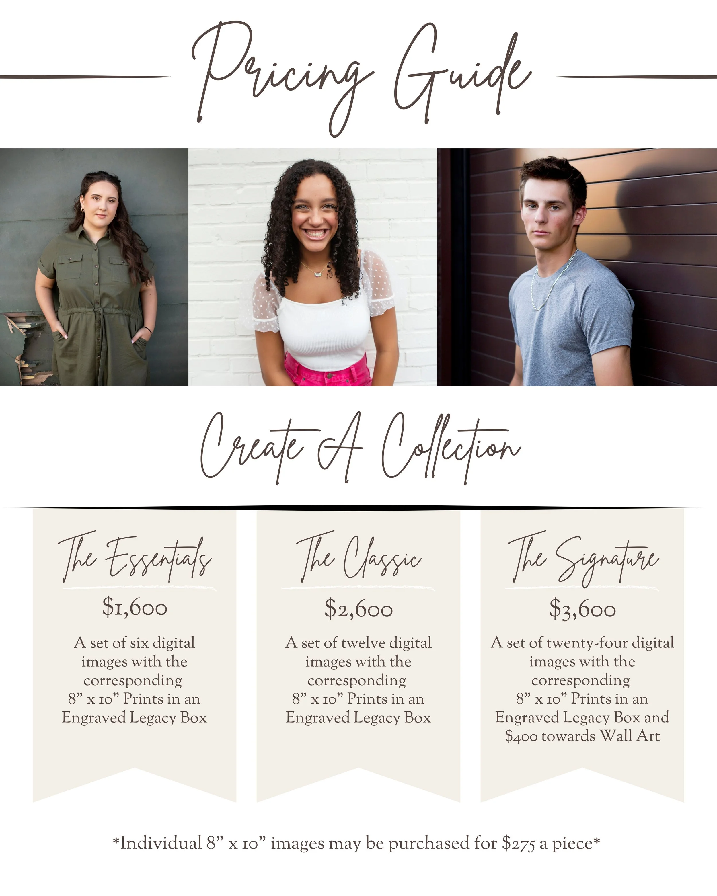 Want to bring your best friend, a football helmet, your sketchbook or a guitar? You got it. From the people who matter to the moments that shaped you- we will honor it all and map it out together, so your session feels like your own personal highlight reel.